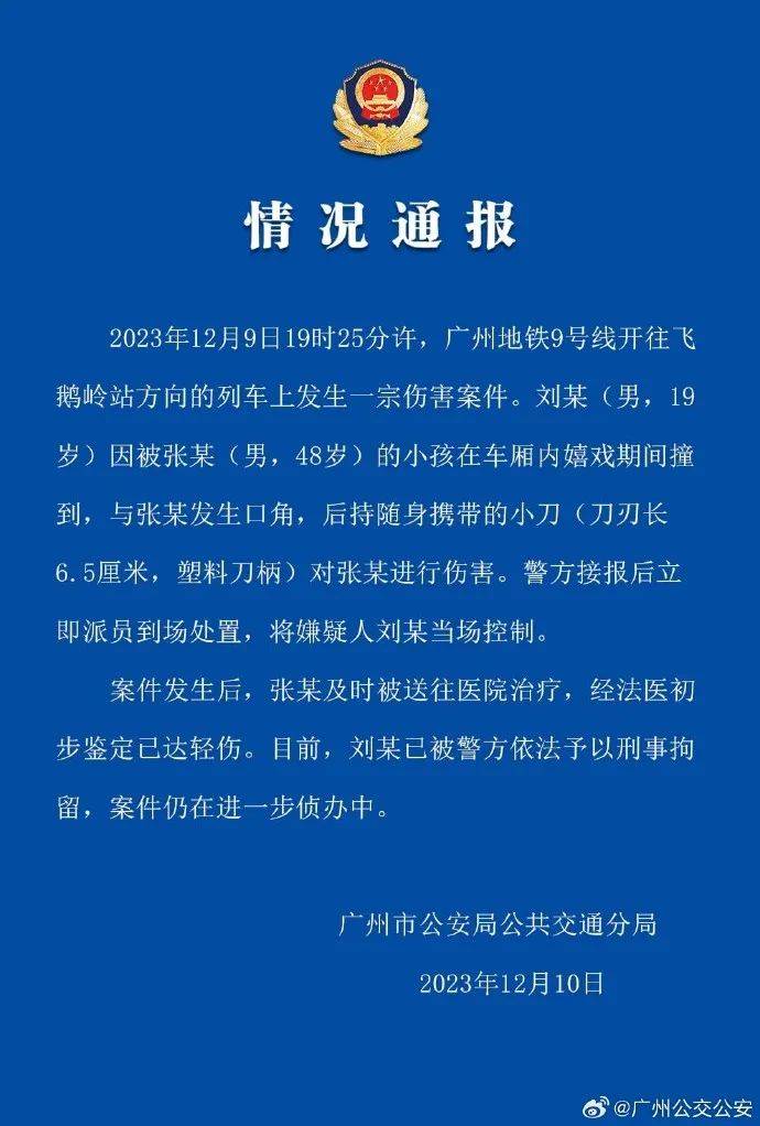 据@广州公交公安,2023年12月9日19时25分许,广州地铁9号线开往飞鹅岭站方向的列车上发生一宗伤害案件。