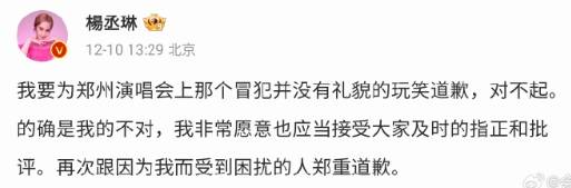 12月10日,她发文就此事道歉:“我要为郑州演唱会上那个冒犯并没有礼貌的玩笑道歉,对不起。的确是我的不对,我非常愿意也应当接受大家及时的指正和批评。再次跟因为我而受到困扰的人郑重道歉。”