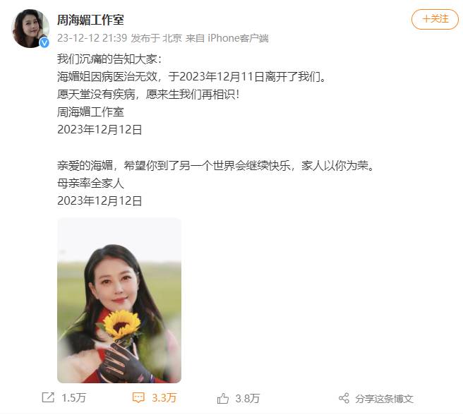 12月12日,周海媚工作室官博发文:周海媚因病医治无效,于2023年12月11日去世。以下为全文:
