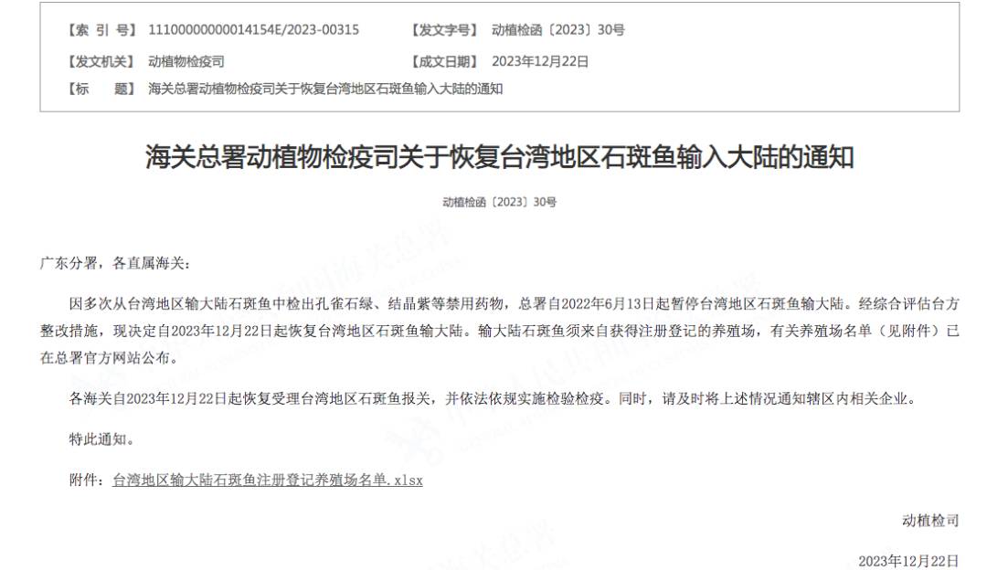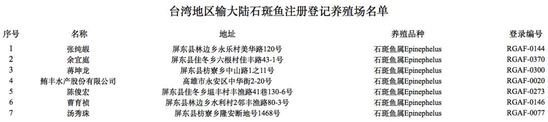 在综合评估相关整改措施的基础上,海关总署决定自12月22日起恢复台湾地区石斑鱼输入,输大陆石斑鱼须来自审核合格并予以注册登记的养殖企业。据了解,一些台湾石斑鱼养殖企业获得首批注册登记,这些企业即日起可向大陆输出石斑鱼。