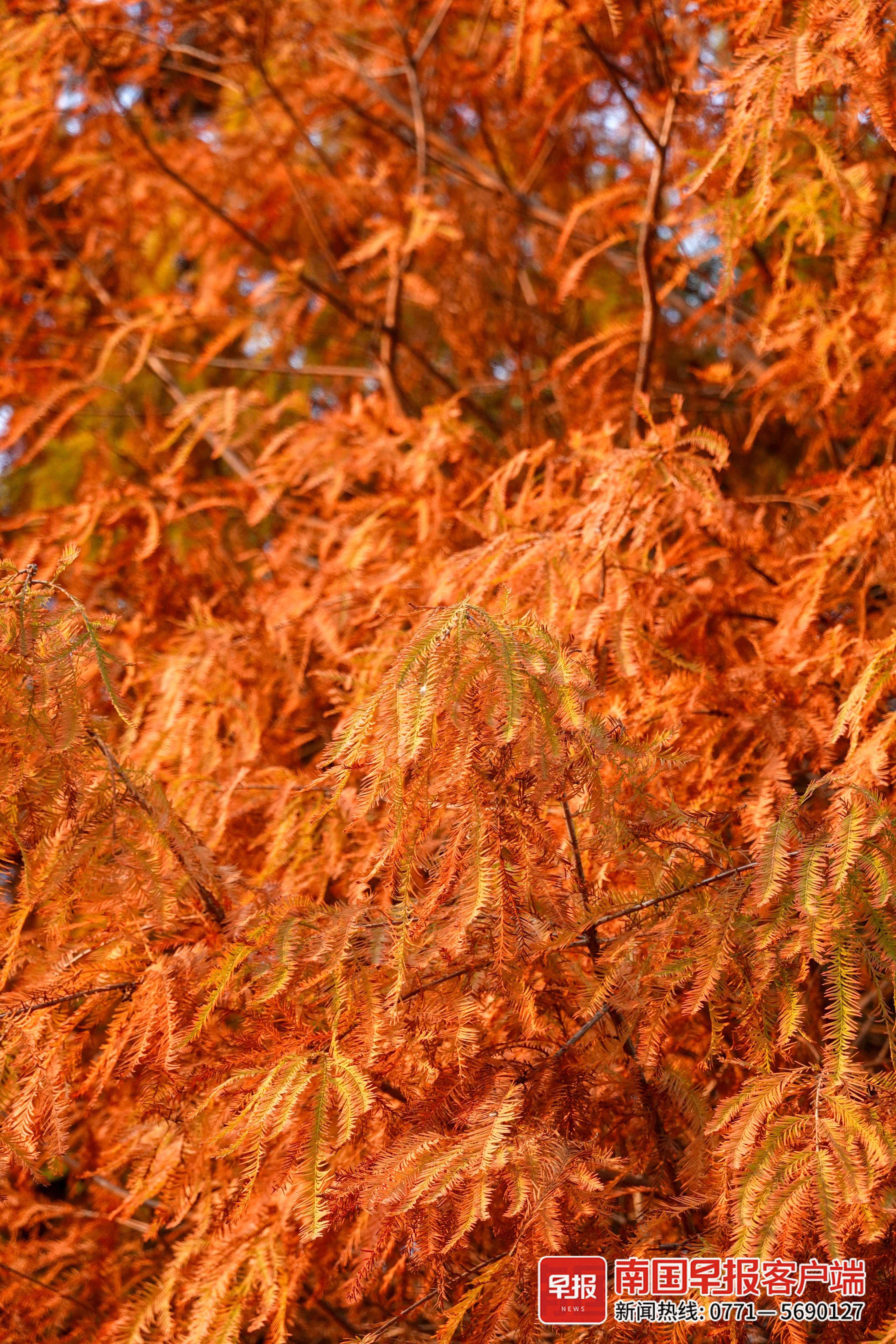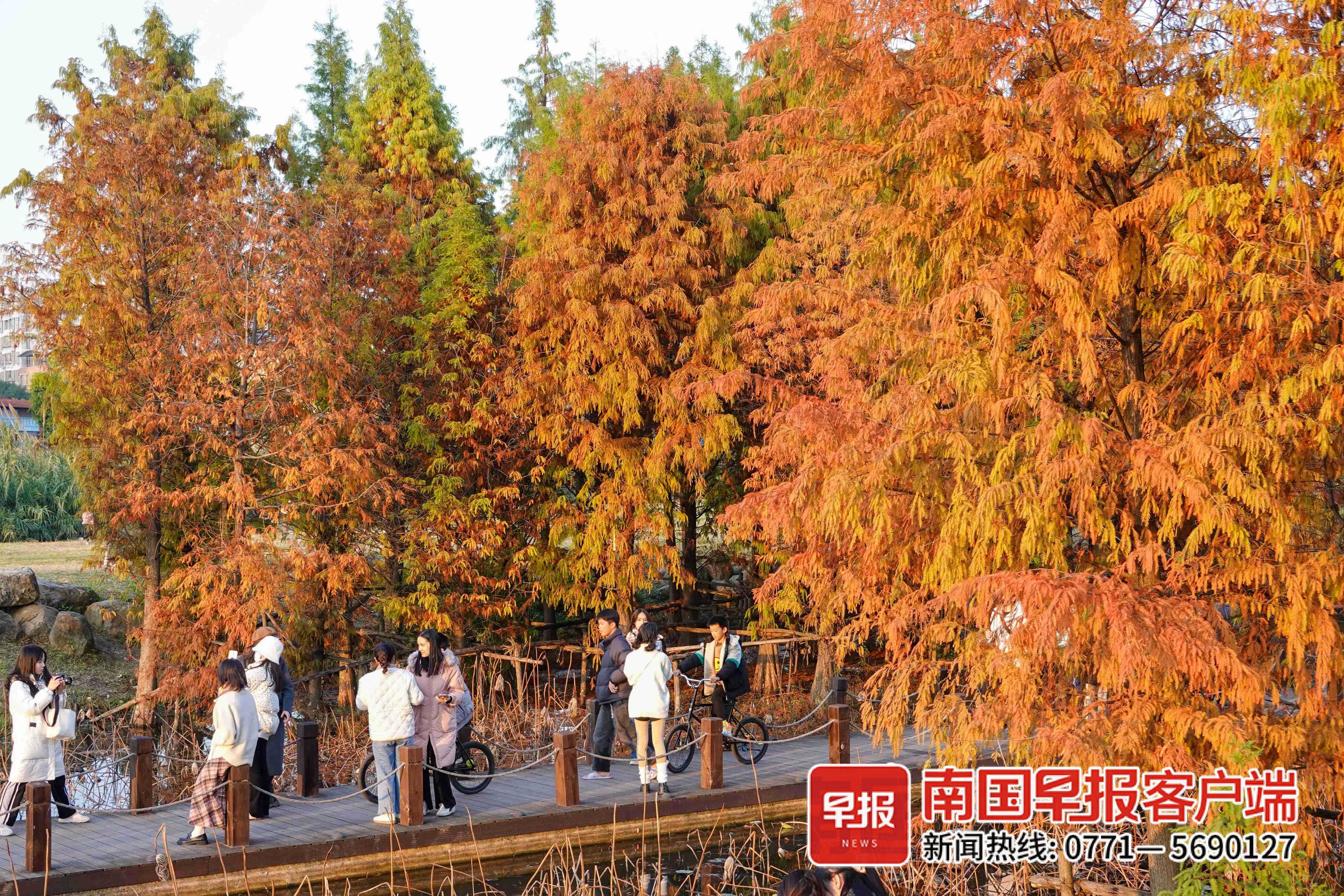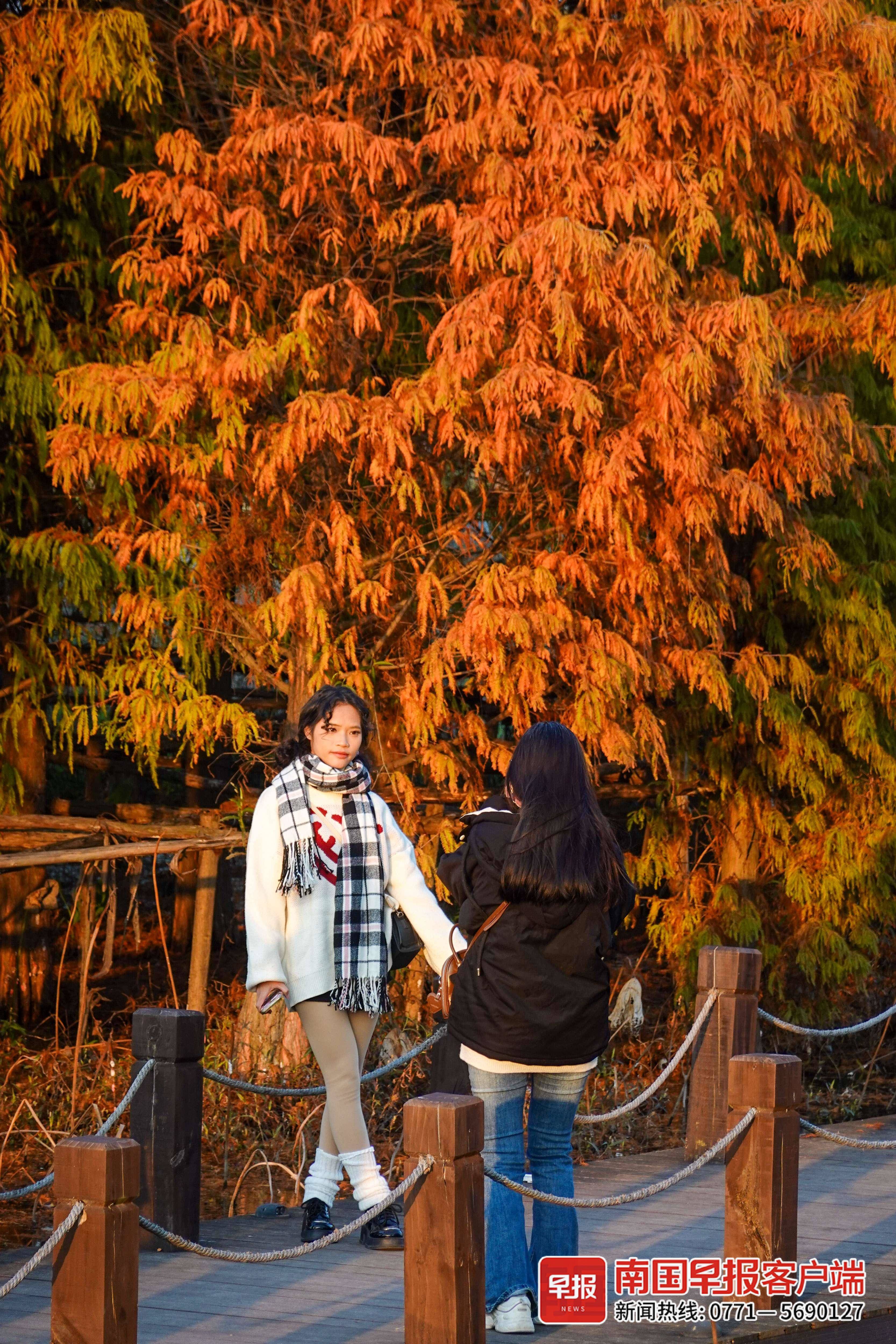 冬日的南宁,是落羽杉骤然变红的时节。近日,北湖湿地公园内的落羽杉,在碧绿色的湖水映衬下尤为醒目,橙红色的叶景,成了市民周末打卡拍照的新景点,也为冬日增加一点暖意。