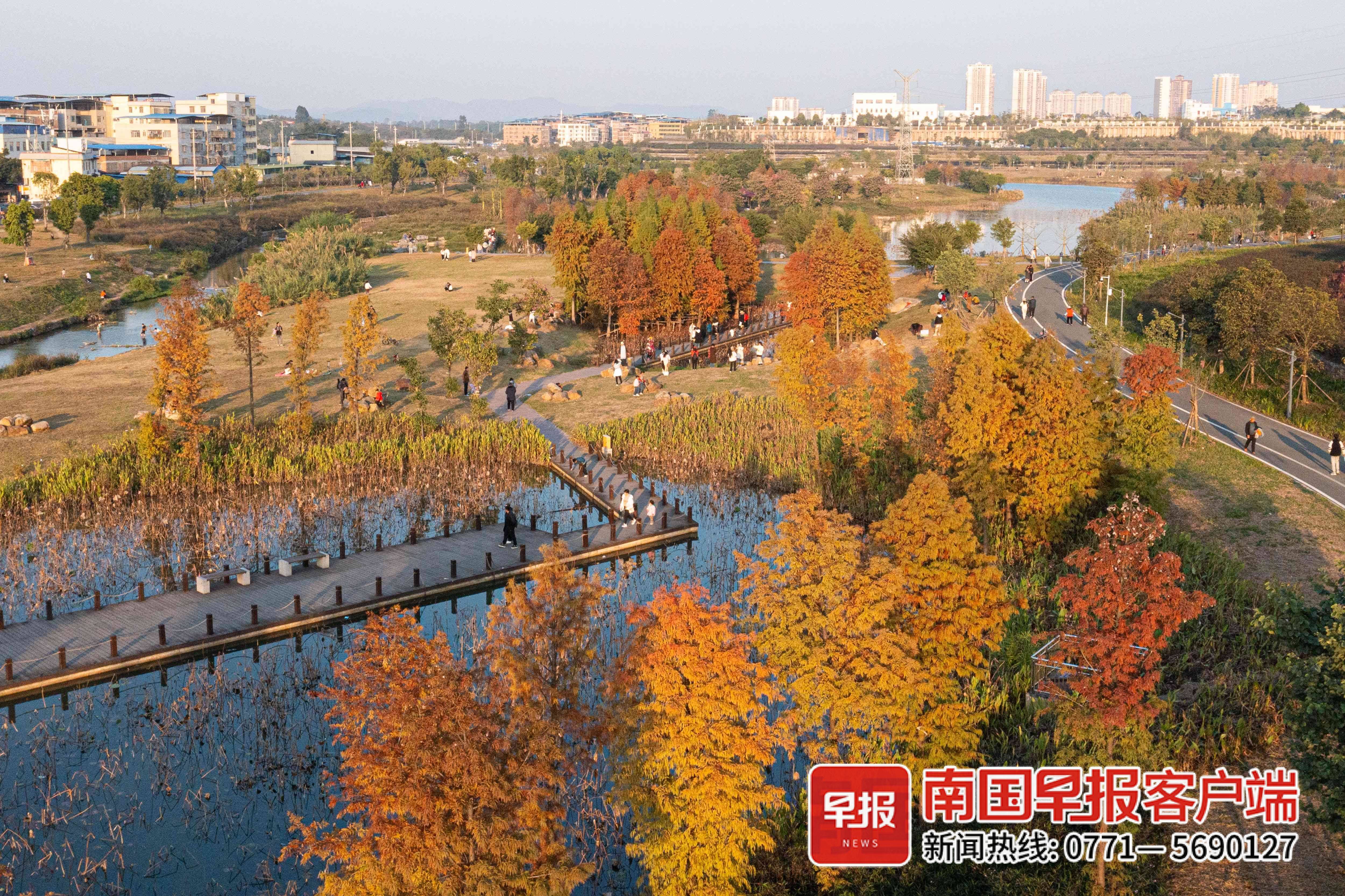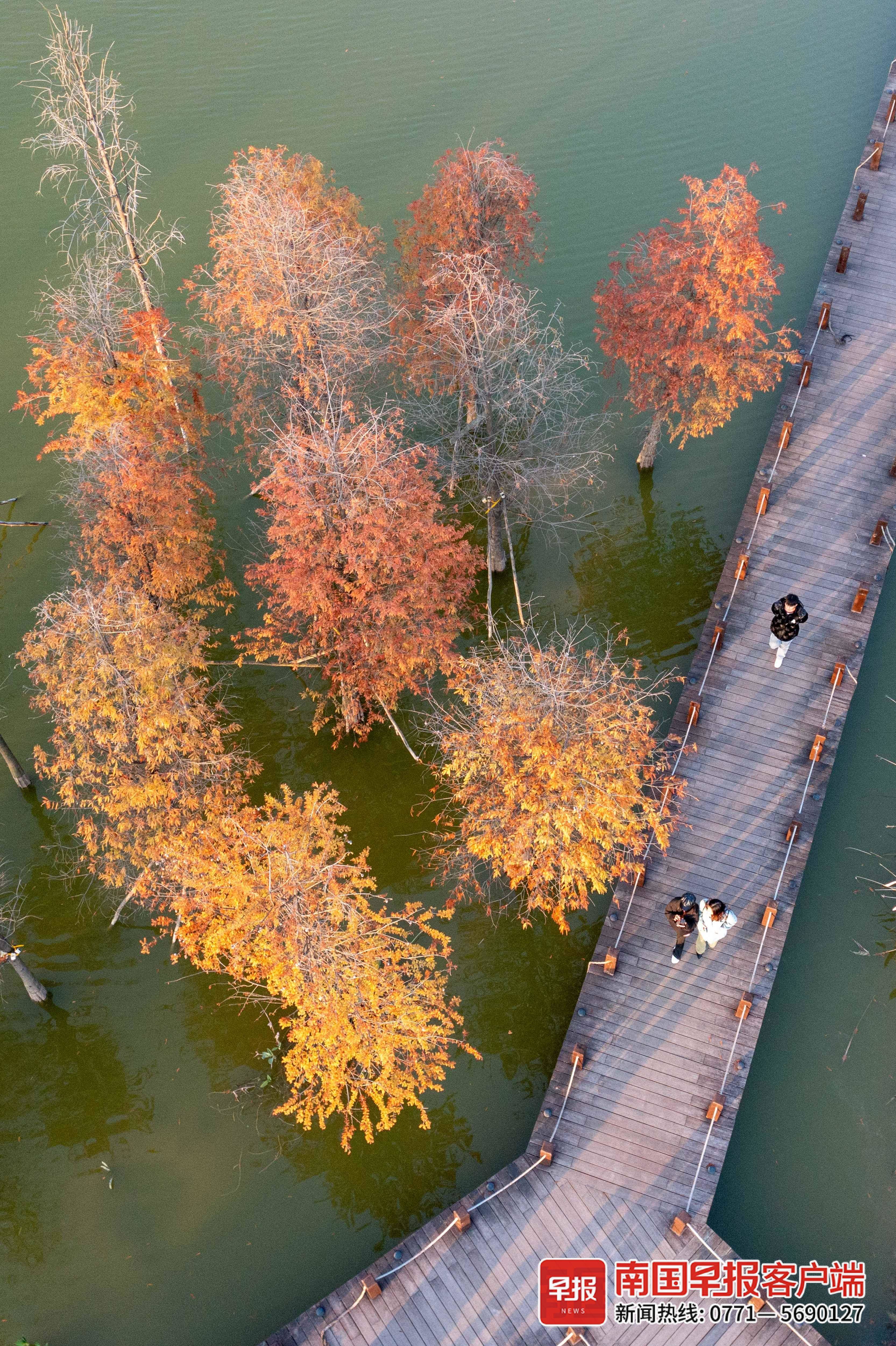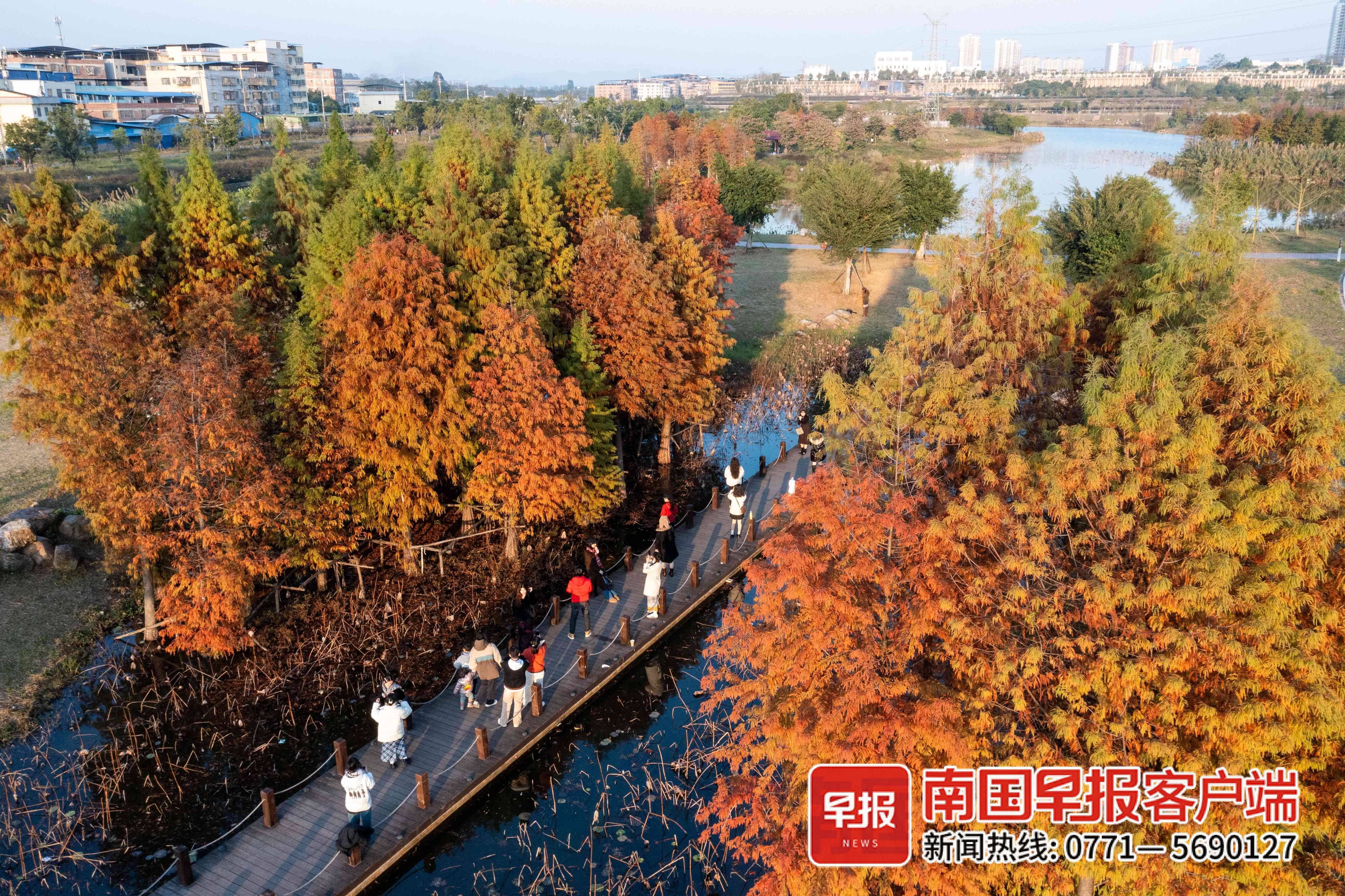 冬日的南宁,是落羽杉骤然变红的时节。近日,北湖湿地公园内的落羽杉,在碧绿色的湖水映衬下尤为醒目,橙红色的叶景,成了市民周末打卡拍照的新景点,也为冬日增加一点暖意。