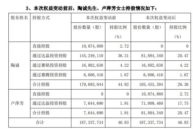 此前,陶诚通过直接持股和间接持股的方式合计持有公司约1.80亿股股票,占公司总股本的44.92%。