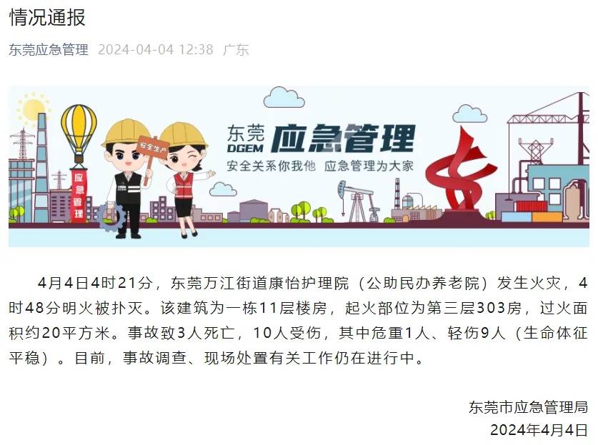 4月4日4时21分,东莞万江街道康怡护理院(公助民办养老院)发生火灾,4时48分明火被扑灭。该建筑为一栋11层楼房,起火部位为第三层303房,过火面积约20平方米。事故致3人死亡,10人受伤,其中危重1人、轻伤9人(生命体征平稳)。目前,事故调查、现场处置有关工作仍在进行中。