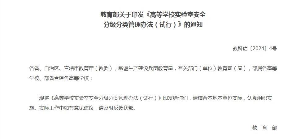 为加强高校实验室安全精细化管理,提高高校实验室安全风险防范的针对性和有效性,教育部近期印发《高等学校实验室安全分级分类管理办法(试行)》,对高校实验室安全分级分类管理的责任体系、工作原则、管理要求等作出相关规定。