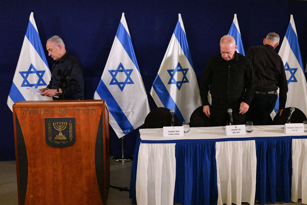 这两张2023年11月18日的资料照片显示的是,以色列战时内阁出席一场在特拉维夫举行的新闻发布会。他们是以色列总理内塔尼亚胡、以色列国防部长加兰特和以色列前国防部长、反对党国家团结党领导人甘茨(从左至右)。