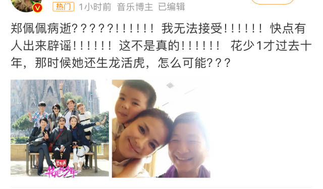 郑佩佩病逝的消息传出后,许多网友表示不敢相信:“无法接受!”“昨天还在重温她的《花儿与少年1》……”“《花少1》才过去十年,那时候她还生龙活虎,怎么可能?”
