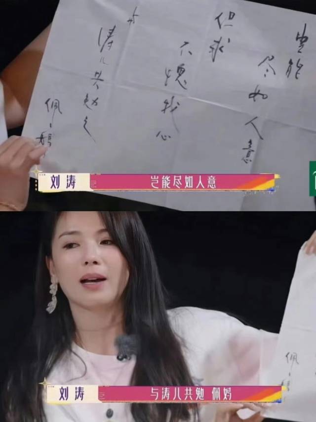 今年5月,刘涛在综艺《花儿与少年·老友记》中哽咽谈及郑佩佩,称郑佩佩身体状况已不太好,走路需要人搀扶。刘涛还向大家展示了郑佩佩当年给她提的字“岂能尽如人意,但求不愧我心”,并表示这句话给了她很多力量。