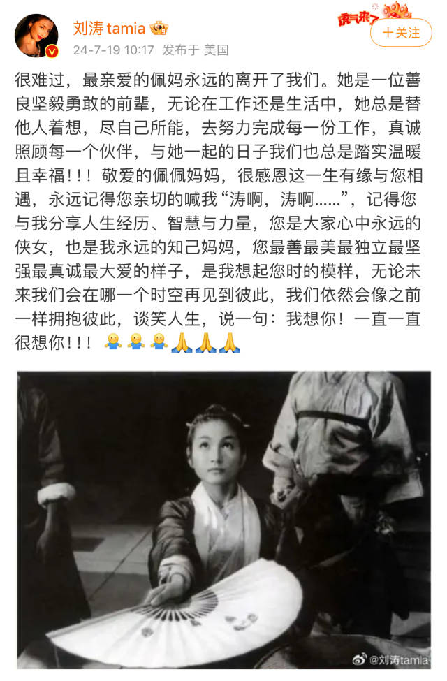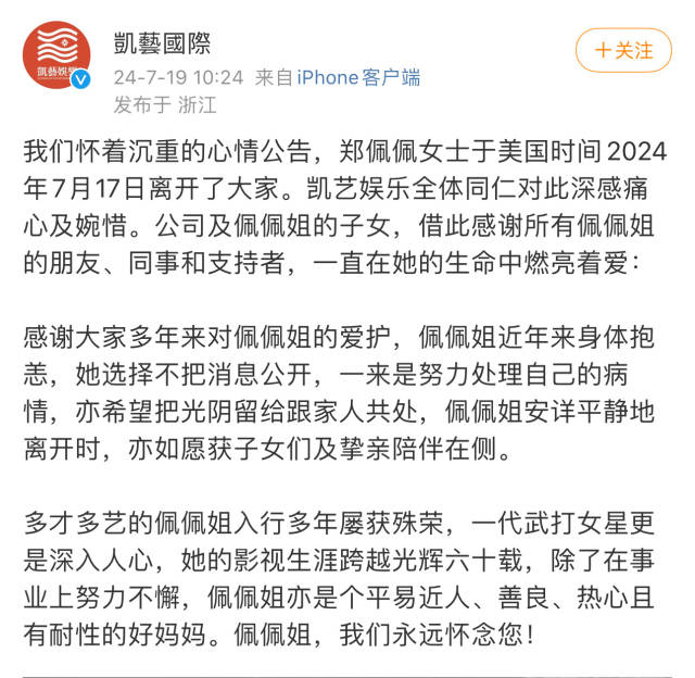上午10点24分,郑佩佩经纪公司凯艺国际发布正式公告,“郑佩佩女士于美国时间2024年7月17日离开了大家”。