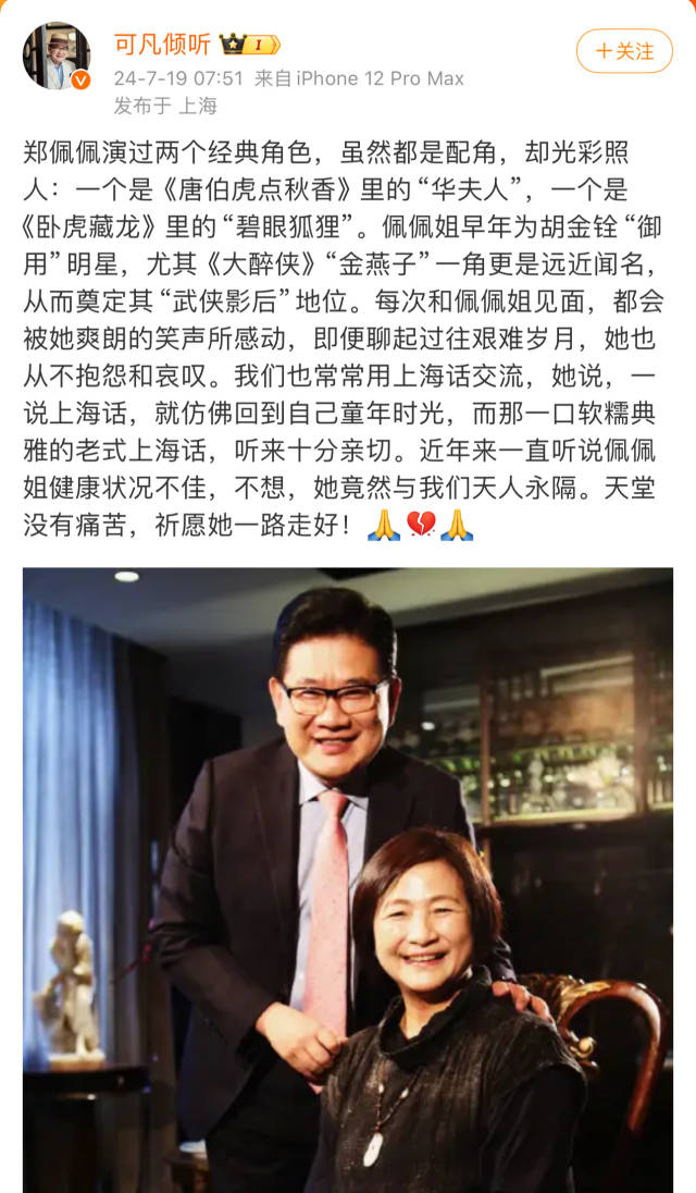 知名主持人曹可凡亦在个人微博上沉痛缅怀郑佩佩,并透露近年来一直听说郑佩佩健康状况不佳,“不想,她竟然与我们天人永隔”。