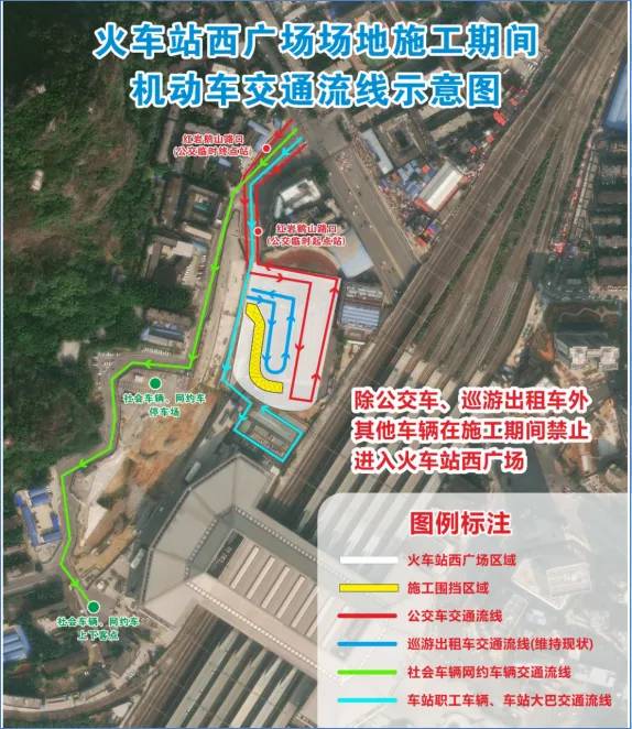 二、封闭施工区域:火车站西广场入口至公交首末站入口之间的场地。