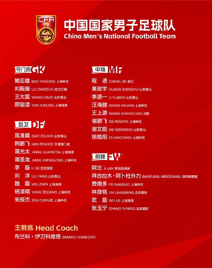 北京时间8月21日,中国男足主教练伊万科维奇以直播形式公布了国足最新一期大名单。本期大名单中的队员,将随队征战2026世预赛亚洲区18强赛的前两轮比赛。