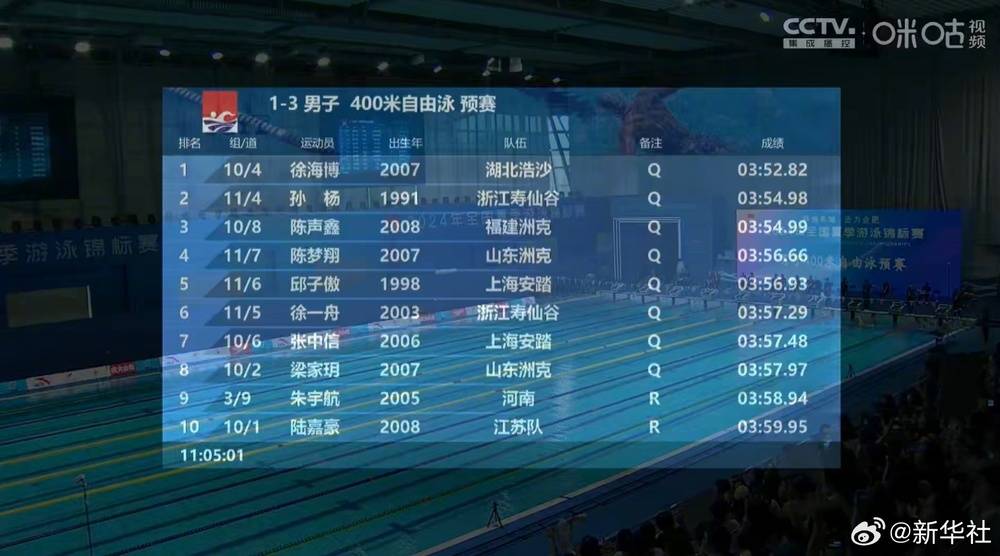 8月25日上午,2024年全国夏季游泳锦标赛男子400米自由泳预赛中,复出后首次征战游泳赛场的孙杨第11组出场,成绩3分54秒98,排名小组第一,位列第2进入决赛。该项目的决赛将于今晚进行,加油!