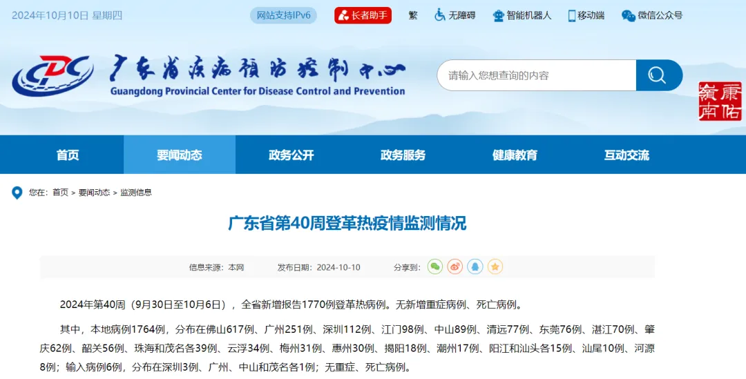 10月8日,“广州疾控i健康”微信公众号发布广州市登革热疫情监测信息通报。消息显示: