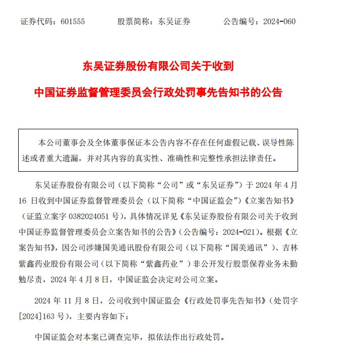 11月8日晚间,东吴证券公告称,公司收到证监会的《行政处罚告知书》。东吴证券涉嫌国美通讯、紫鑫药业非公开发行股票保荐业务未勤勉尽责,中国证监会对该案已调查完毕,拟依法作出行政处罚。