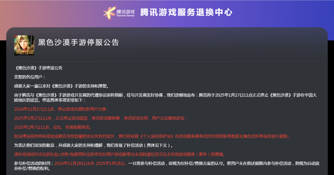 针对此次停运,腾讯推出了相应的补偿方案。在正式停服前,玩家可依据各自账户余额情况,获取《黑色沙漠》端游版本、《天龙八部》手游或《完美世界》手游的专属福利礼包。