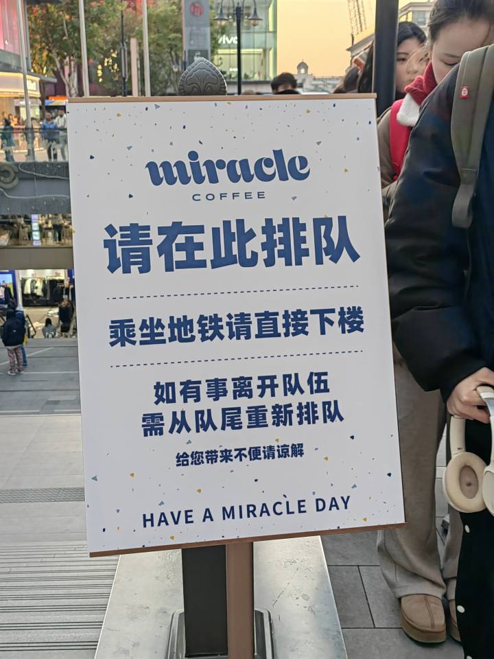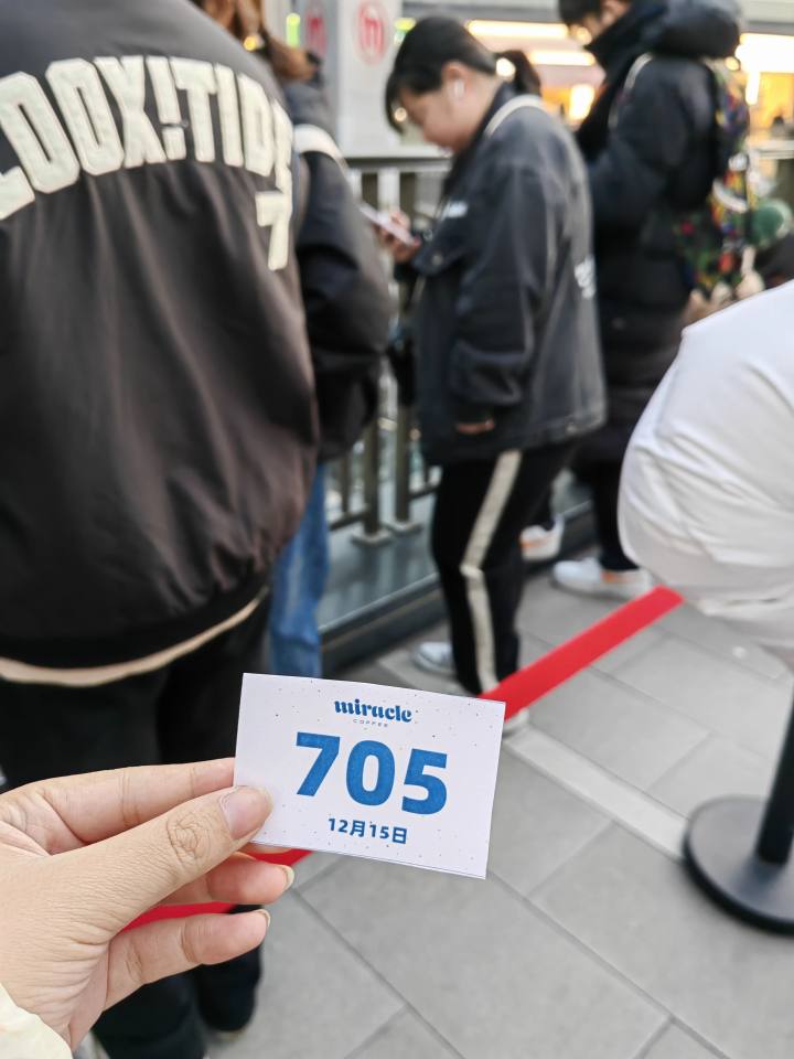 Miracle Coffee门店外有围起来的区域,里面大概有几十个年轻人在排队,本来以为排队的人就只有门店的这几十位,结果抬头一看,原来这几十位年轻人只是提前领号后,手上的号码到时间了才进场排队的,上面还有近百号在排队领号的年轻人。