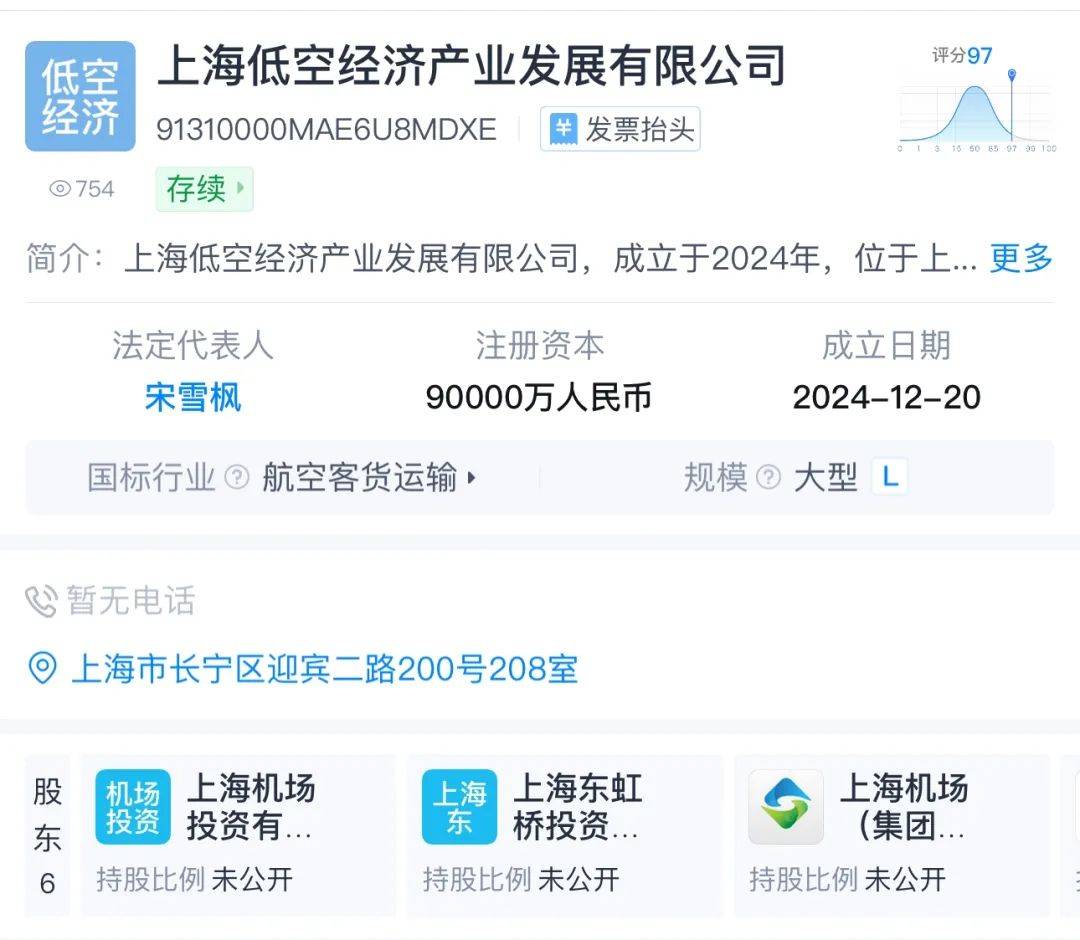 天眼查APP显示,上海低空经济产业发展有限公司股东方具体包括:上海机场投资有限公司、上海东虹桥投资发展(集团)有限公司、上海机场(集团)有限公司、上海信息产业(集团)有限公司、上海久事(集团)有限公司以及上海城建(集团)有限公司。以上均为实力雄厚的本土知名国企,不过,各家的持股比例尚未公开。