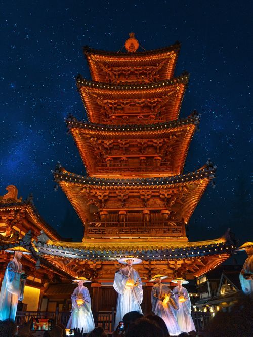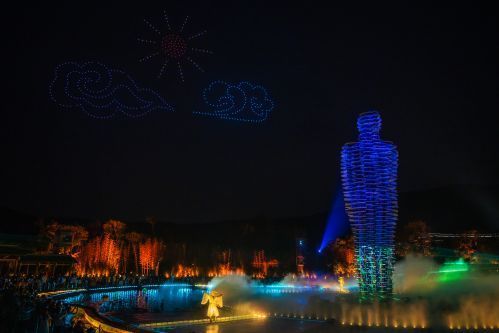 无人机烟花秀也是来拈花湾不能错过的演出之一。千架无人机在拈花湾的夜空中编织出一幅幅绚丽的图案,每一幅画面都充满了美好祝福和未来愿景,与璀璨烟花交相辉映,构成了一幅幅令人陶醉的画卷。