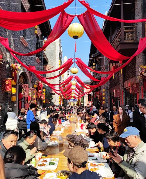 在詹王厨艺的用餐区,最热闹的位置便属2025年央视春晚长桌宴的拍摄地,如今这里已成为汉口里的网红打卡点,只见在40米的长桌两边,市民游客们争相拍照打卡。
