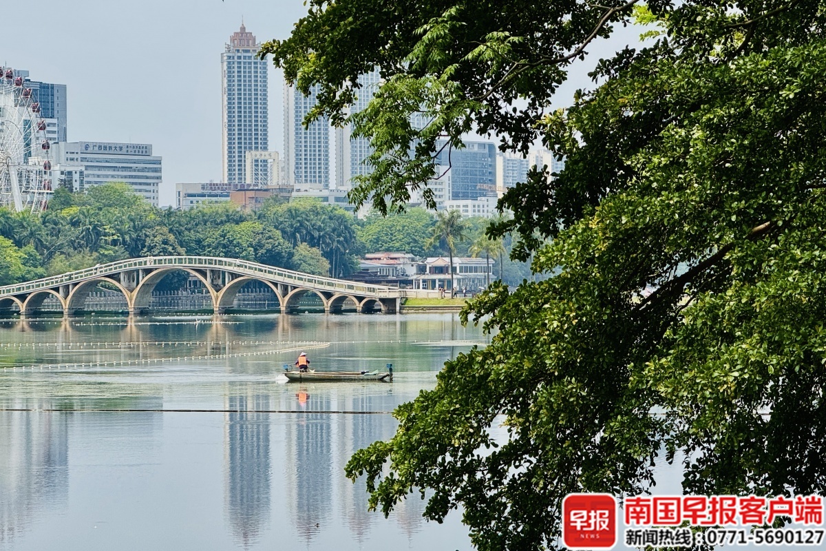 5月5日,南宁市天气晴,工人在南湖公园水面上捞水草。