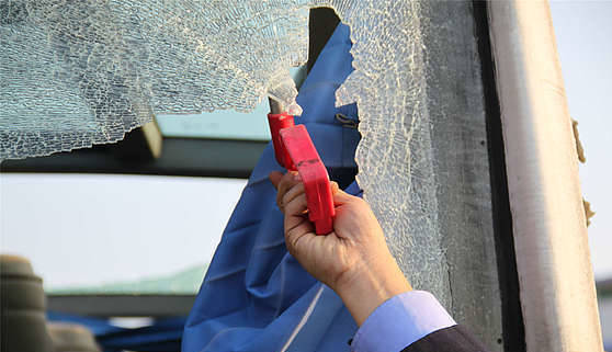 2、车内一般配有安全锤。紧急情况下,乘客可用“安全锤”击碎侧窗玻璃逃生。找不到安全锤,可用重物、皮带或高跟鞋猛击钢化玻璃的四周。