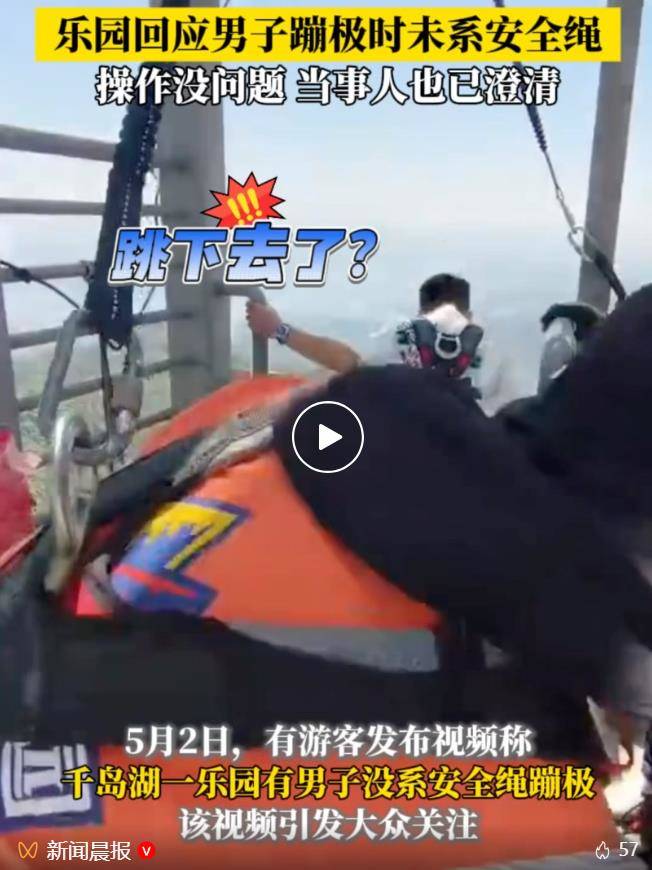 5月3日,一段“男子后背未系安全绳走下蹦极跳台,致一旁工作人员诧异惊叫”的视频,引发关注。5月4日,记者从事发的杭州千岛湖沪马探险乐园了解到,该男子身体前侧系了安全绳,安全措施已经做到位。当时一旁工作人员惊叫是因为“他下去得太匆忙了,(师傅)没有反应过来”。(点击查看详情)