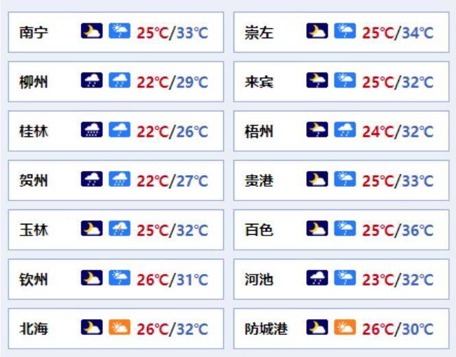 南宁市:多云有阵雨或雷雨,东南风2级,最低气温25℃,最高气温33℃。