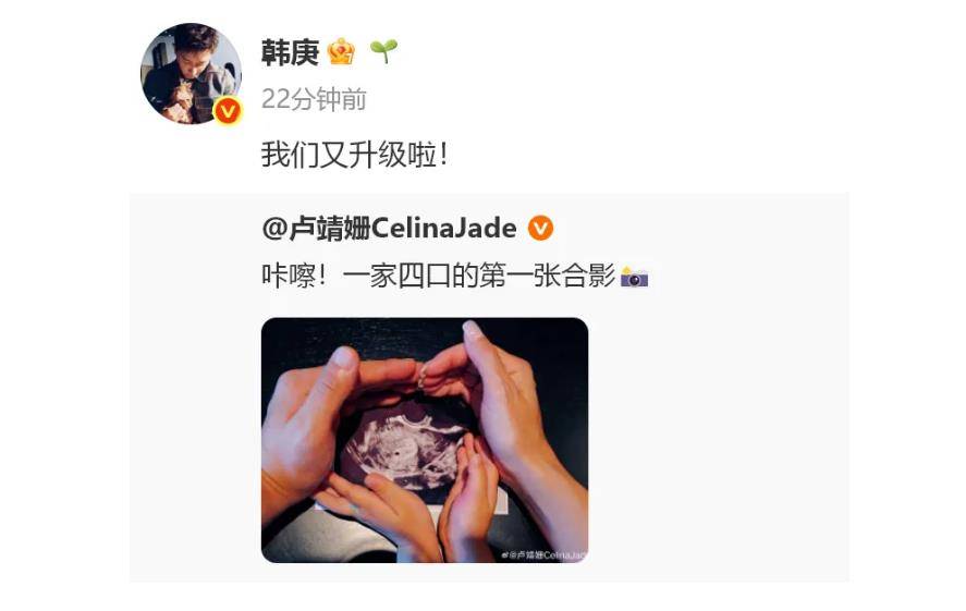 5月4日,知名男星韩庚转发其妻子卢靖姗晒出二胎B超照片的博文“咔嚓!一家四口的第一张合影”,并表示:“我们又升级啦!”