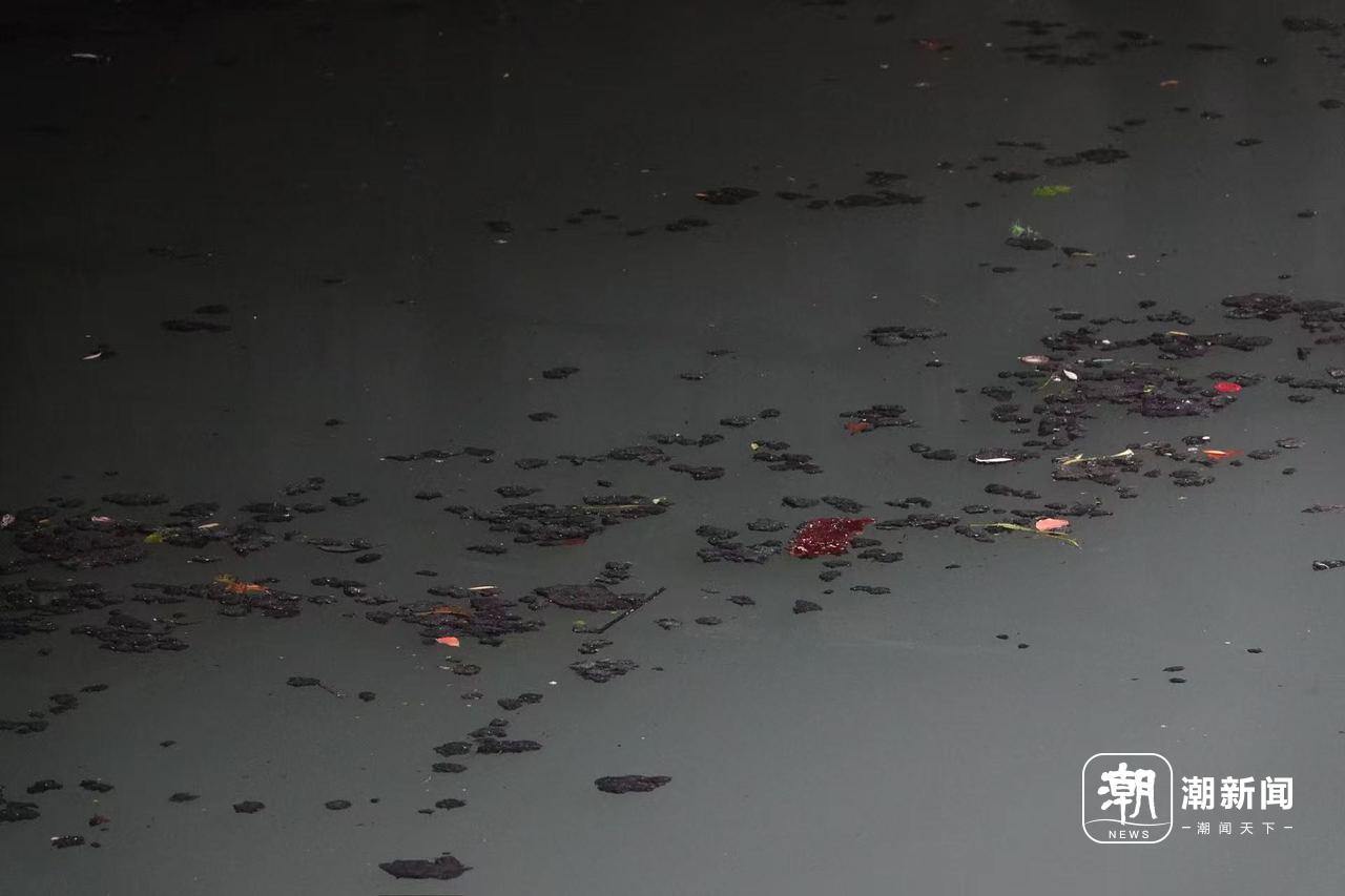 ▲水面上流动着黑色漂浮物。