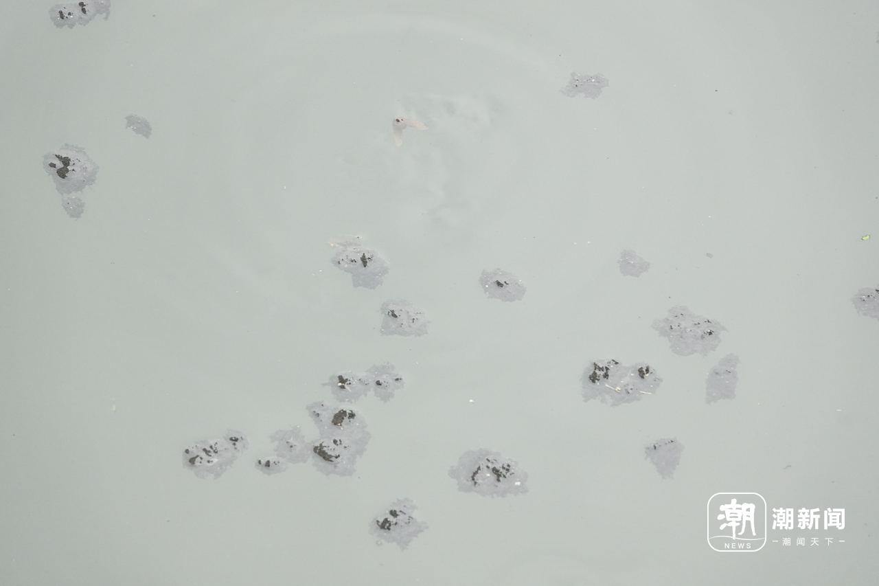 ▲河道水面上流动着黑色漂浮物。