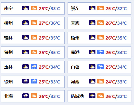 ▌7月25日,百色、崇左、防城港、钦州、北海、玉林等市有小到中雨、局地大雨或暴雨,其他地区多云局地有阵雨或雷雨。全区大部地区最高气温34~36℃、局地37℃以上。 ▌