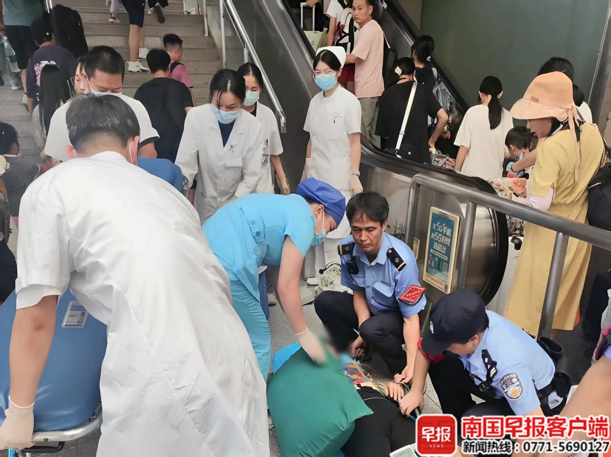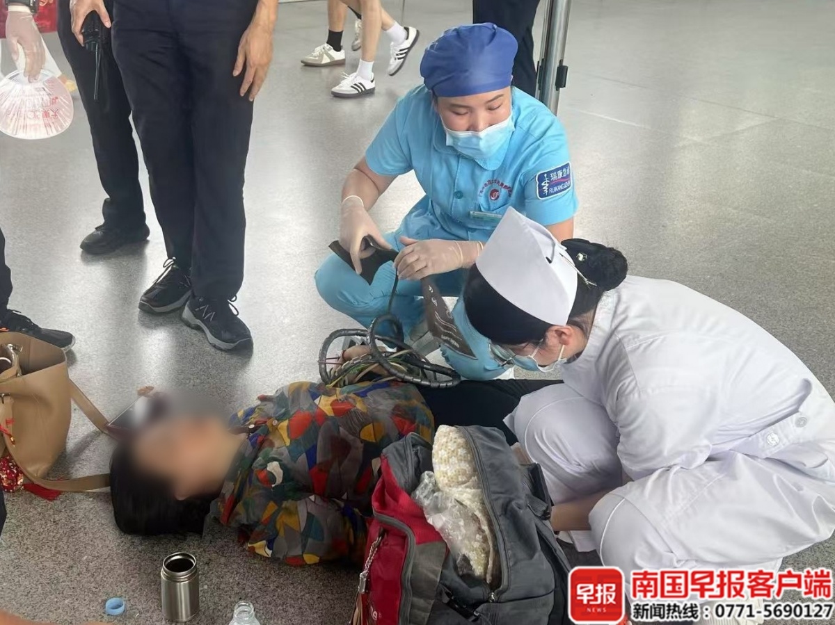 7月26日下午,50多岁的谢女士在南宁火车站进站乘车时突然晕倒,失去呼吸和意识,客运员发现后迅速赶到现场展开救援,在工作人员与热心旅客合力救助下转危为安。
