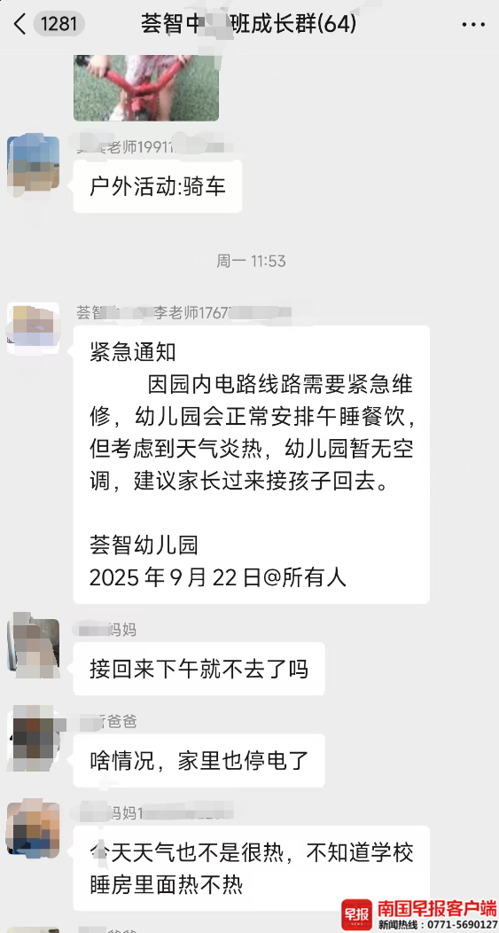 陈先生告诉南国早报全媒体记者,9月初,他交了6000余元学费将孩子送到南宁市荟智幼儿园上学。9月22日中午,幼儿园老师在班级群发紧急通知称,因园内电路线路需要紧急维修,幼儿园暂无空调,建议家长将孩子接回家。此后,家长就没再接到幼儿园复课的信息。