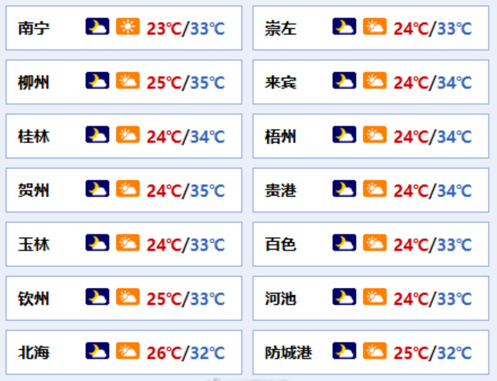 南宁市:多云间晴,偏南风1~2级,最低气温23℃,最高气温33℃。
