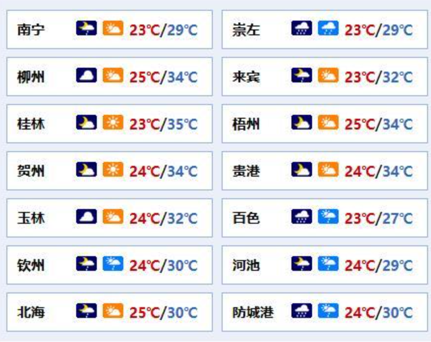 南宁市:阴天有小雨,东南风2~3级、阵风6~7级,最低气温23℃,最高气温29℃。