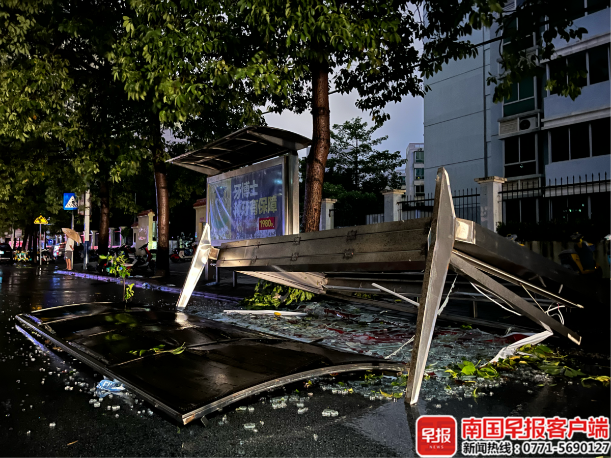 ▲10月5日晚,北海市杭州路,一个公交亭被大风吹倒。