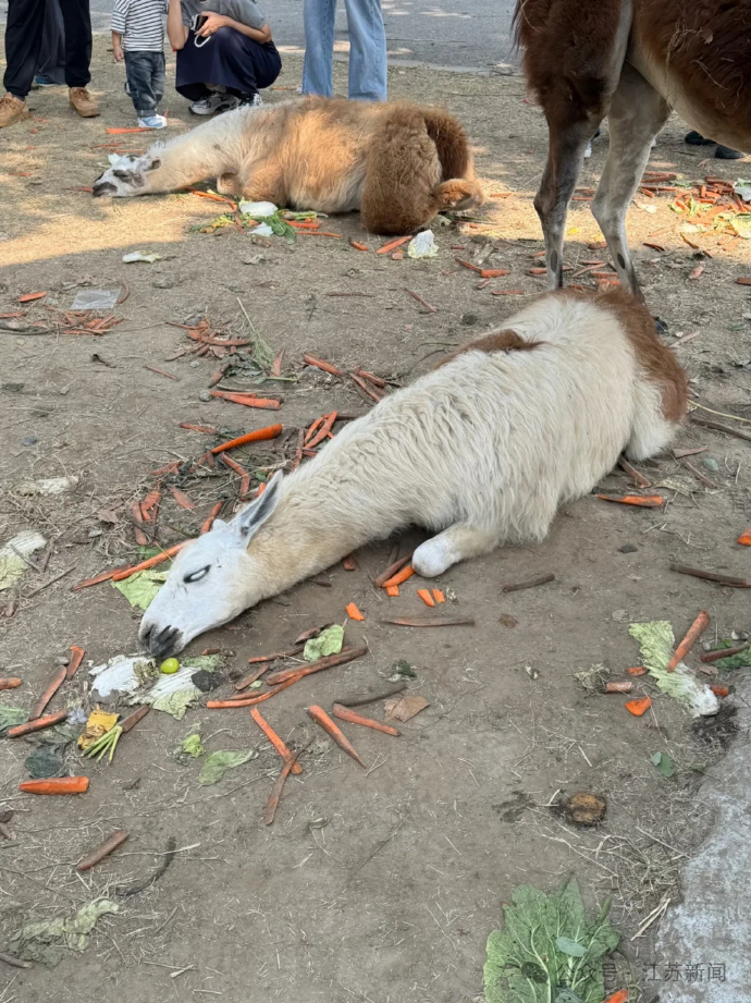 近日,有网友发帖称,江苏南通森林野生动物园内多只羊驼因游客过量投喂,吃撑倒地且翻白眼。10月7日,园内工作人员证实确有此事。网友担心动物会被撑死,工作人员表示有饲养员在一旁观察情况,“它们吃饱了就不张嘴了”。(点击查看详情)