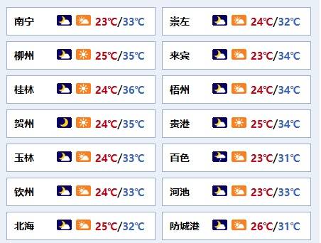 南宁市:多云间晴、局地有阵雨,东南风1~2级,最低气温23℃,最高气温33℃。