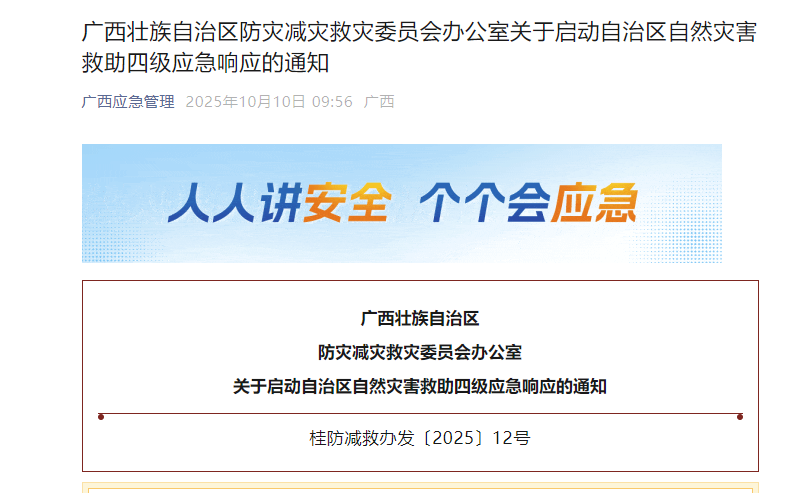 10月10日,自治区防灾减灾救灾委员会办公室下发通知,针对今年第21号台风“麦德姆”(强台风级)造成的灾情,根据《广西自然灾害救助应急预案》有关规定,自治区防灾减灾救灾委员会办公室决定于10月10日10时启动自治区自然灾害救助四级应急响应,请各市、各有关单位按照预案要求做好救灾救助工作。