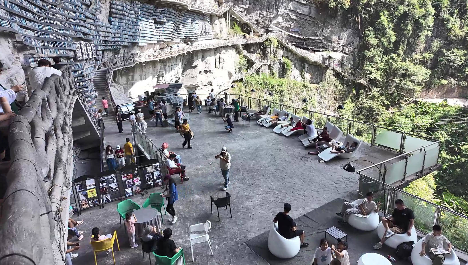 游客在悬崖书店沉浸式体验阅读和欣赏美景。