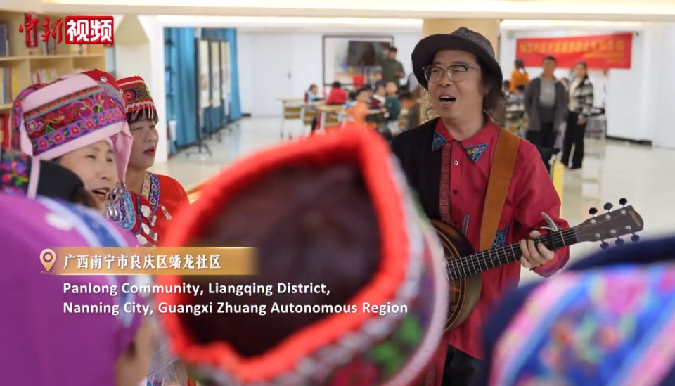 “那天你问我,幸福是什么?我想悄悄告诉你,幸福是首歌嘿嘹嘹啰……”在广西南宁蟠龙社区,社区合唱团的各族群众经常一起排练歌曲《幸福嘹嘹啰》。2023年12月14日,习近平走进了蟠龙社区,身着民族服装的社区居民热情地演绎了这首极具地方特色的民歌。习近平饶有兴趣地询问歌曲创作情况,并鼓励居民们团结友爱,携手奋进。在这个常住人口2.7万的社区中,共居住着汉族、壮族、瑶族、仫佬族等15个民族,能歌善舞的各族群众以歌传情,唱响美好新时代。