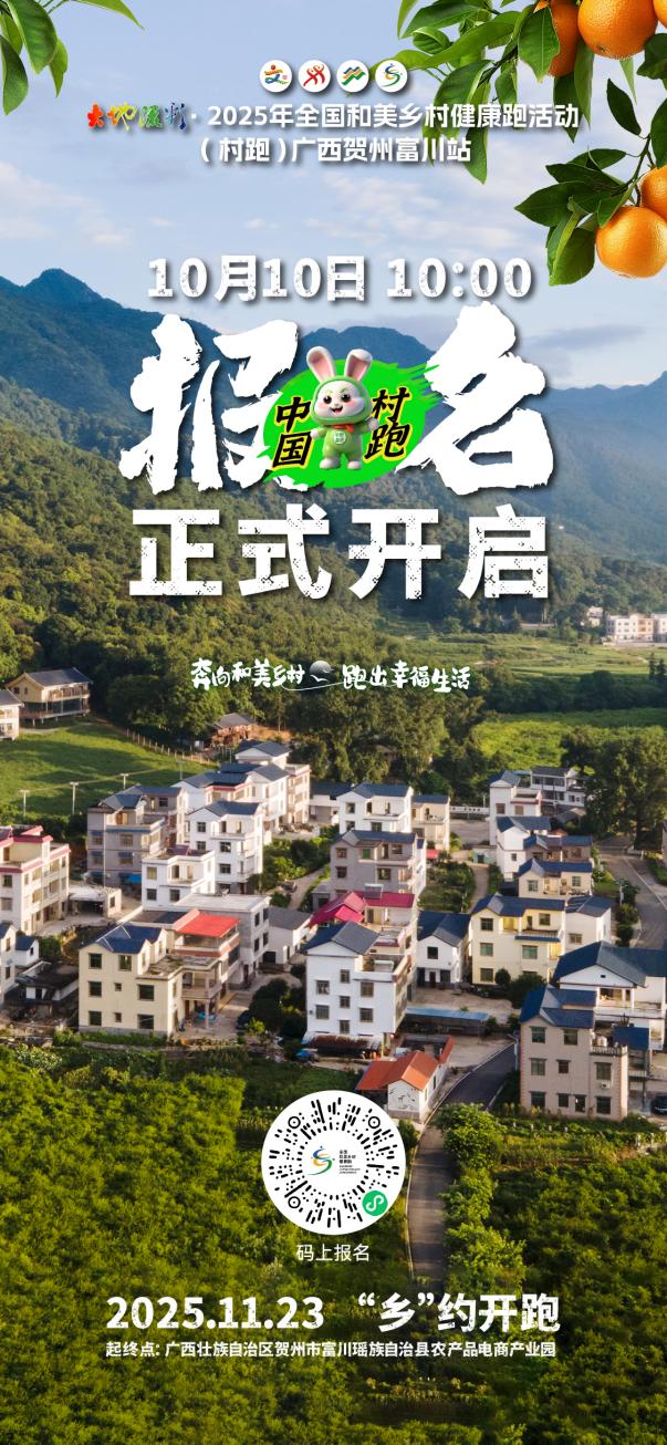 11月23日,大地流彩·2025年全国和美乡村健康跑活动(村跑)将在广西贺州富川开跑,报名通道已于10月10日开启。活动以“奔向和美乡村,跑出幸福生活”为主题,融合农民体育活力与和美乡村魅力,引领跑友共赴一场山水田园间的“甜蜜之约”。