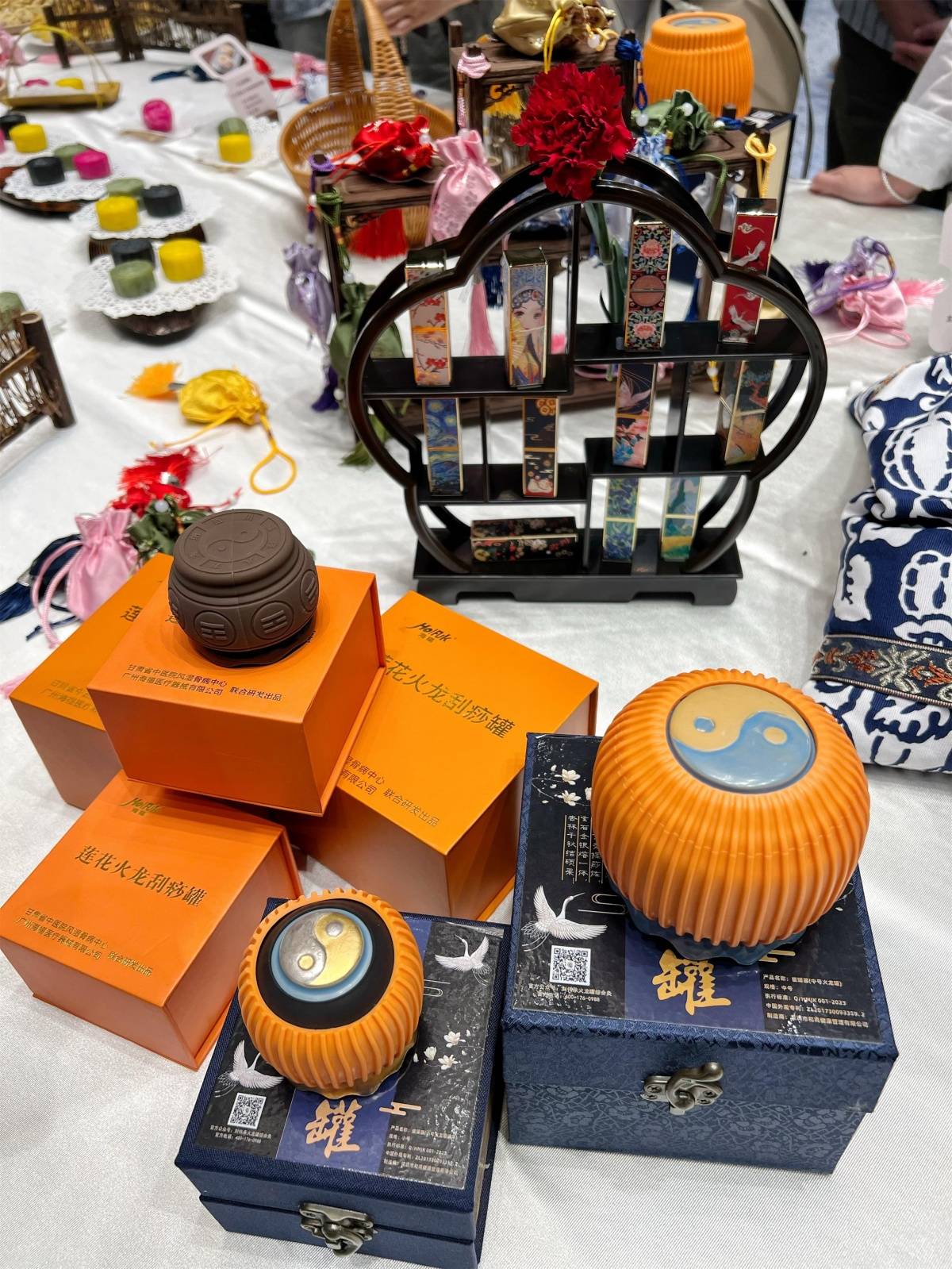 ▲会场外展示的中医药文化产品。