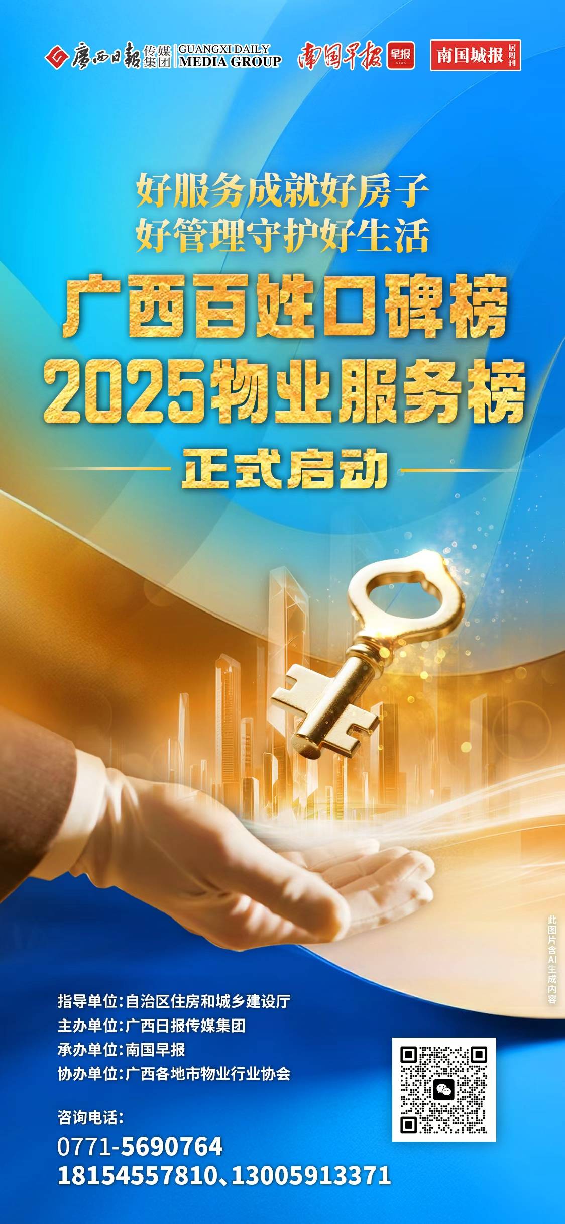 即日起,由自治区住房和城乡建设厅指导、广西日报传媒集团主办、南国早报承办的“广西百姓口碑榜——2025物业服务榜”(简称“广西物业服务口碑榜”)正式启动,再度吹响广西物业服务行业品质提升的“集结号”。这项已连续举办六年的行业盛事,今年将以“好服务成就好房子 好管理守护好生活”为主题,带来五大创新亮点,持续探索基层治理新样板,树立服务新标杆。