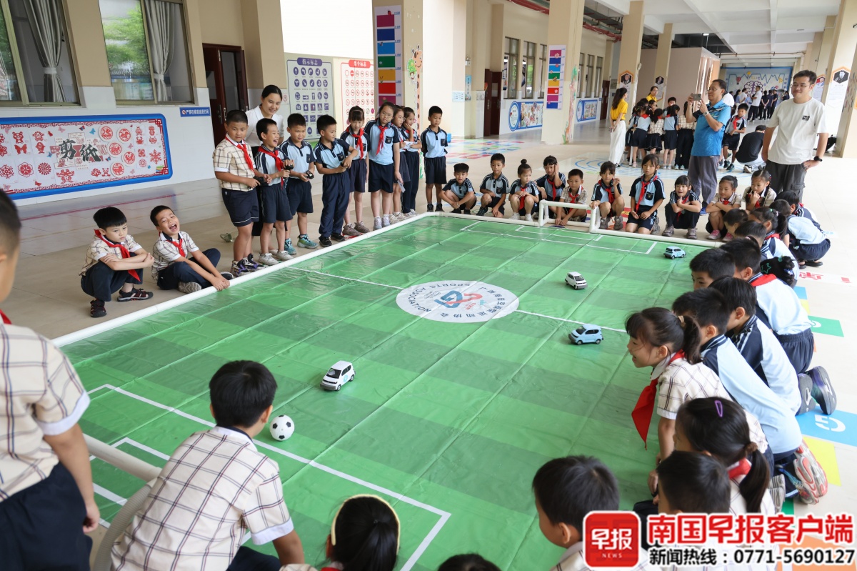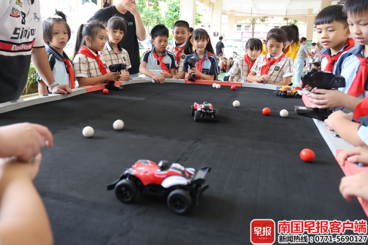 在活动现场,由南宁市航海模型运动协会、南宁市车辆模型运动协会带来了多种科技体育体验项目,设有遥控台球车、无人机足球、遥控足球车以及火焰掌科学实验等内容。
