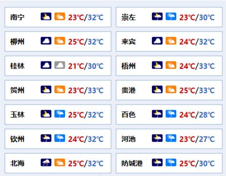 南宁市:多云、局地有阵雨或雷雨,东南风1~2级,最低气温23℃,最高气温32℃。
