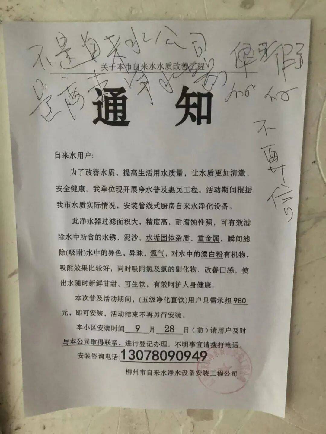 近日,有网友反映,有人冒充自来水公司工作人员,到柳州市东环大道12号居民小区推销净水器。柳州市自来水有限责任公司明确表示,从未委托任何单位或个人销售净水设备。(点击查看详情)