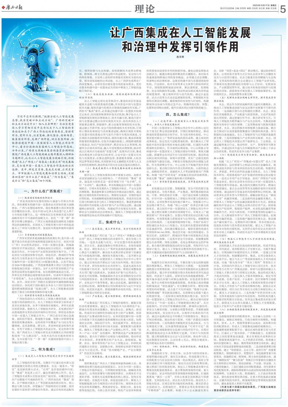 能否在人工智能发展和治理中掌握主动权,直接关系国家战略安全与区域影响力。广西承担的“集成”使命,就是助力国家在这一前沿领域下好“先手棋”、打好“主动仗”。通过集成,率先构建起适应中国—东盟区域特点、引领未来发展的人工智能技术体系、产业生态和治理框架。集成意味着主动塑造而非被动适应规则,通过建立区域性的技术标准互认、数据安全流动、伦理价值共识等机制,有效破解跨境发展的制度瓶颈,形成具有区域引领力和国际竞争力的人工智能发展范式。集成更意味着将治理环节深度嵌入技术扩散与产业升级全过程,通过敏捷响应新场景、新风险,构建起符合发展优先原则、兼顾安全与创新的动态治理体系,确保人工智能在服务国家构建周边命运共同体战略中行稳致远。