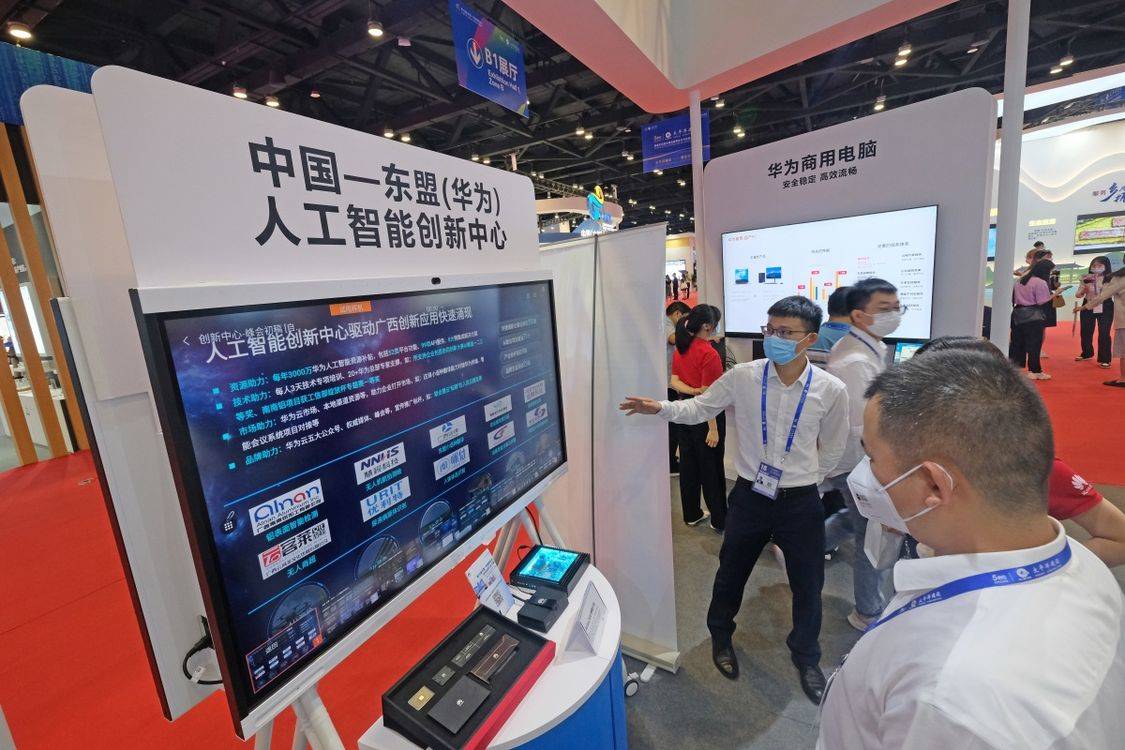 在中国—东盟(华为)人工智能创新中心展位,工作人员正在介绍自主研发的产品。记者 徐天保 摄 (广西云-广西日报)